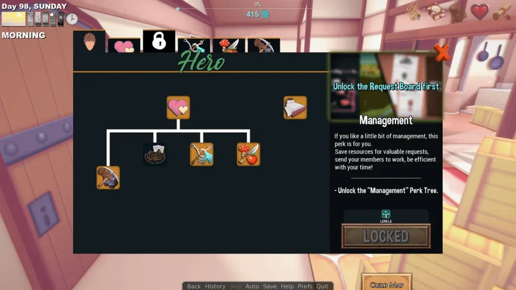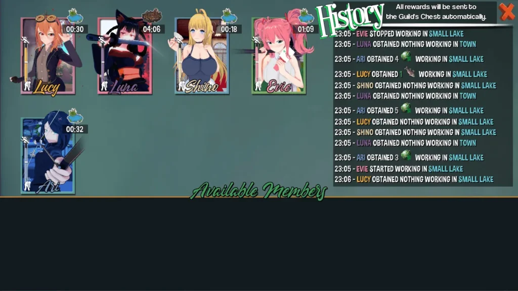 Each character has a set of skills: Gathering, Crafting, Combat Training, etc. Through the Management Ledger, you assign them to tasks that match their skills. Assign Lucy, with her high Gathering skill, to “Collect Herbs,” and she’ll bring back more than someone else would. This is the heart of resource gathering in Hero’s Harem Guild.